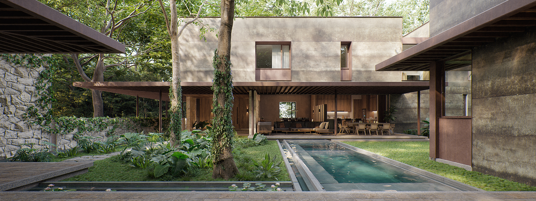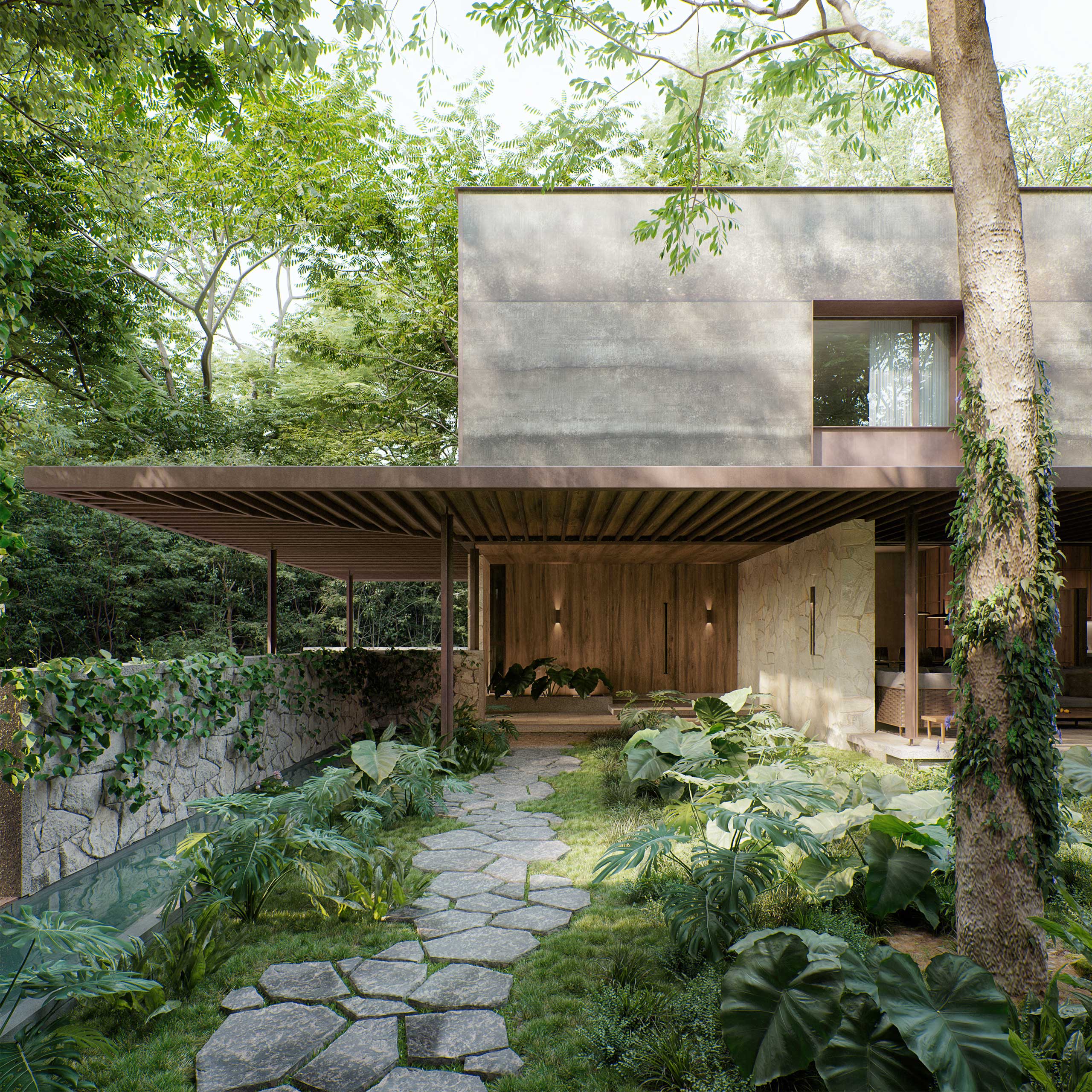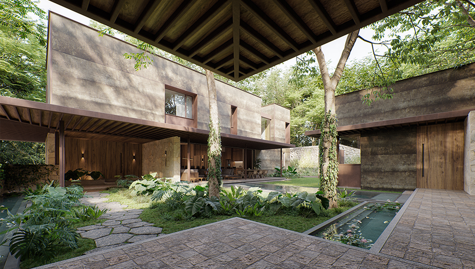 Dentro de lo que una vez fue la hacienda Sodzil, se encuentra el proyecto inmerso entre la vegetación preexistente, una casa compuesta por una serie de volúmenes conectados por recorridos y remates acompañados por la iluminación difusa que se genera entre las copas de los árboles. La materialidad con apariencia natural como madera, piedra y acero oxidado le aportan mayor riqueza al proyecto con el paso del tiempo y le permiten a la casa conciliar con lo natural y los elementos preexistentes de la ex hacienda.