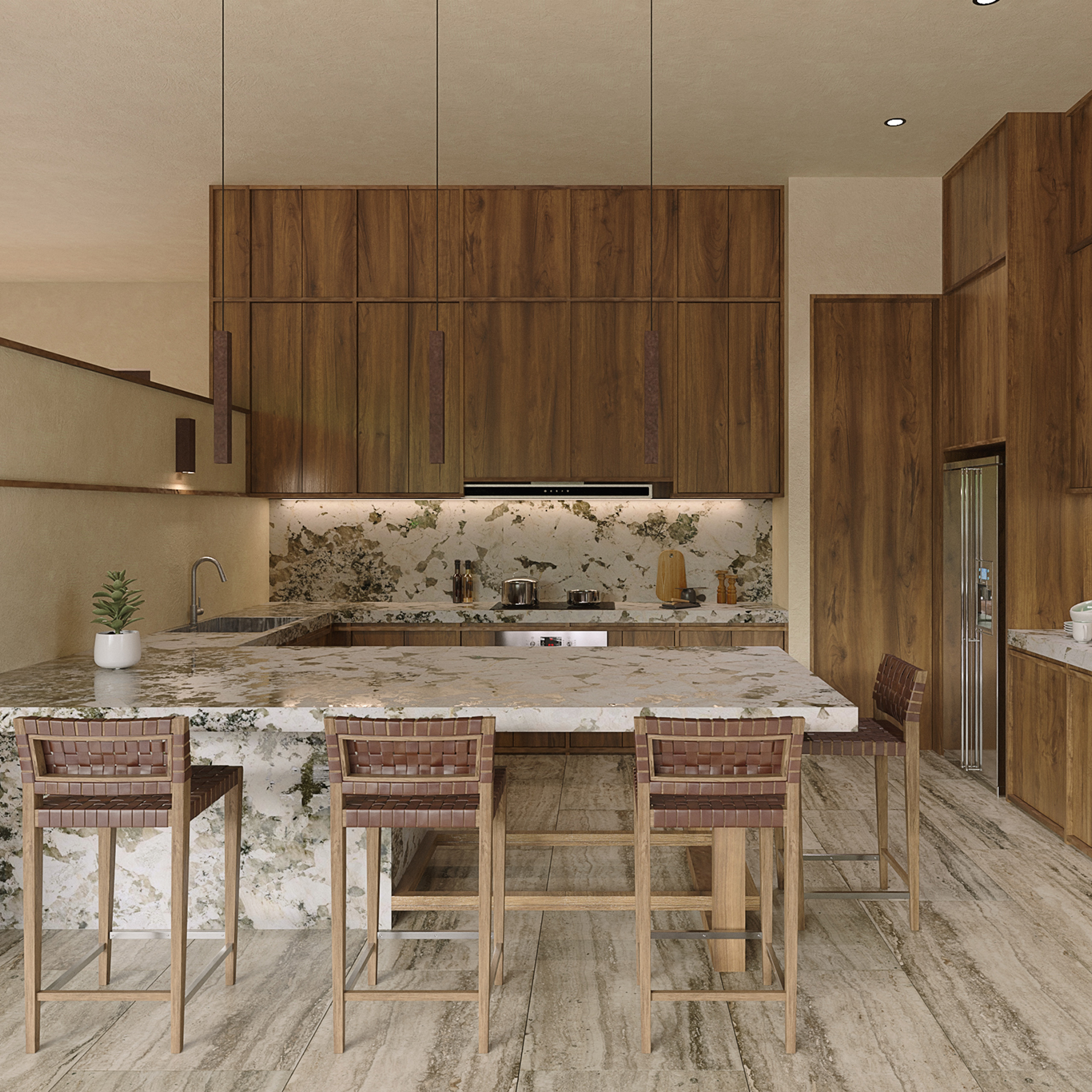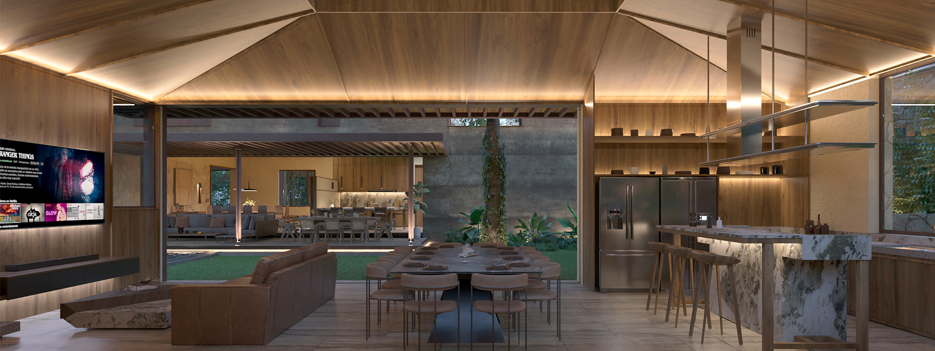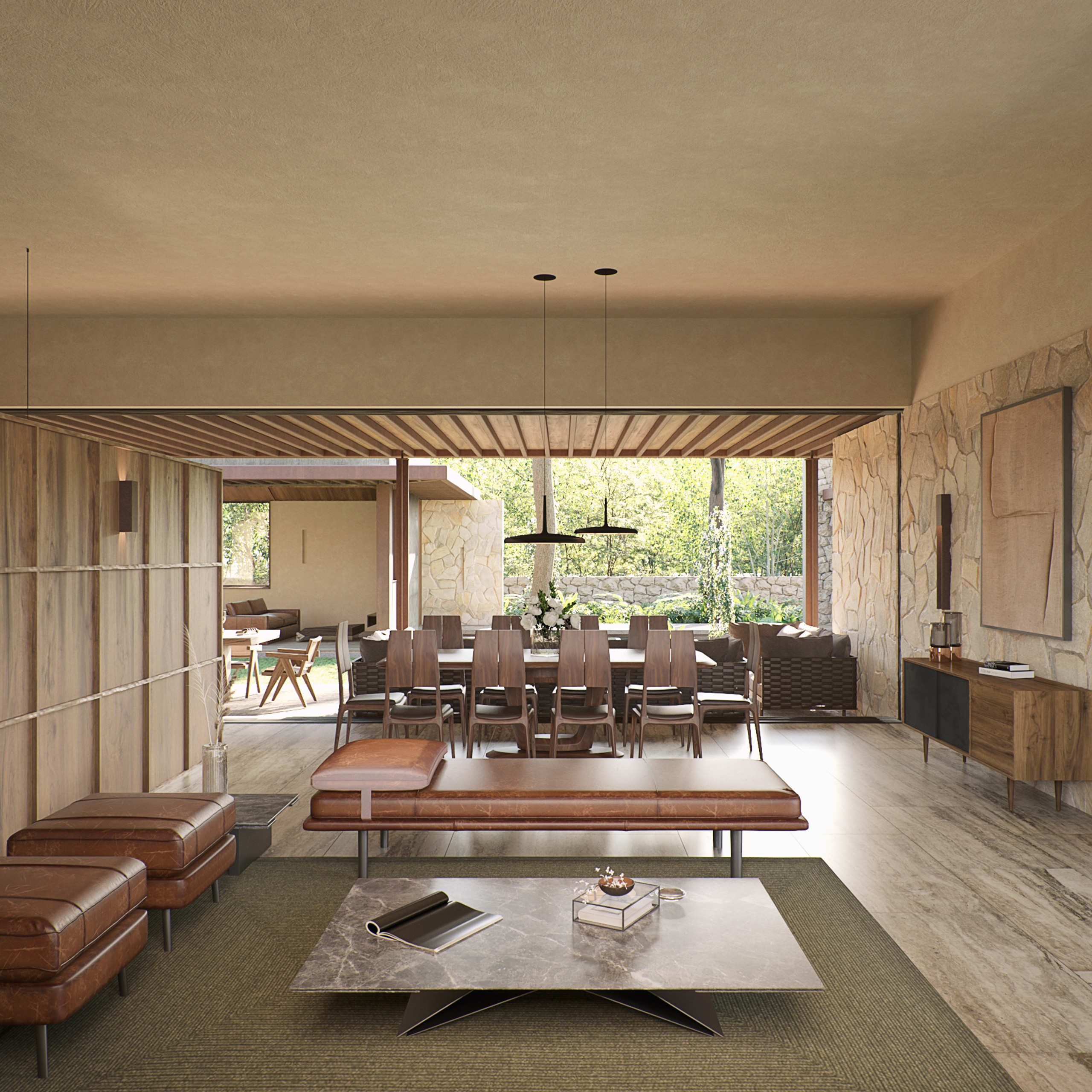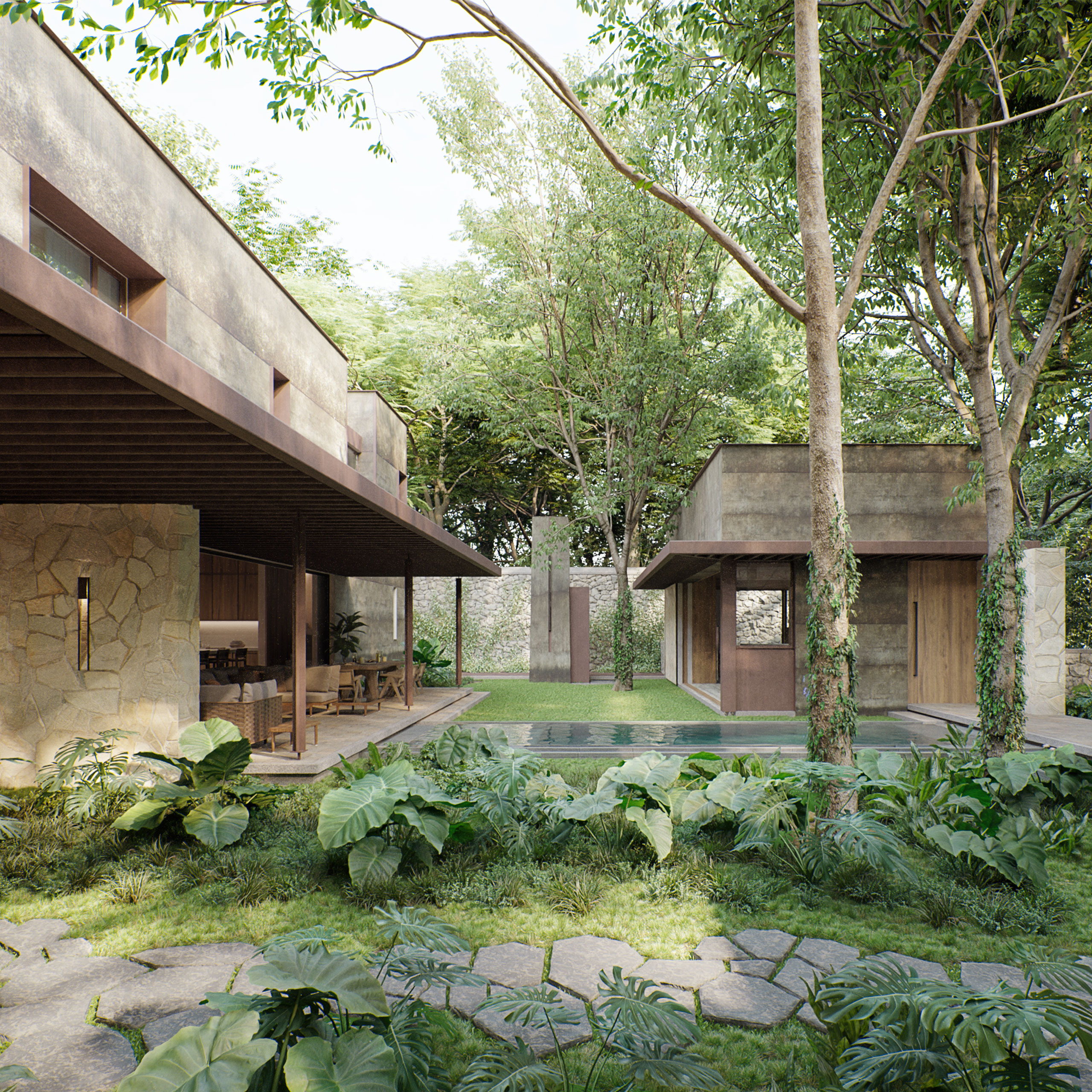 Dentro de lo que una vez fue la hacienda Sodzil, se encuentra el proyecto inmerso entre la vegetación preexistente, una casa compuesta por una serie de volúmenes conectados por recorridos y remates acompañados por la iluminación difusa que se genera entre las copas de los árboles. La materialidad con apariencia natural como madera, piedra y acero oxidado le aportan mayor riqueza al proyecto con el paso del tiempo y le permiten a la casa conciliar con lo natural y los elementos preexistentes de la ex hacienda.